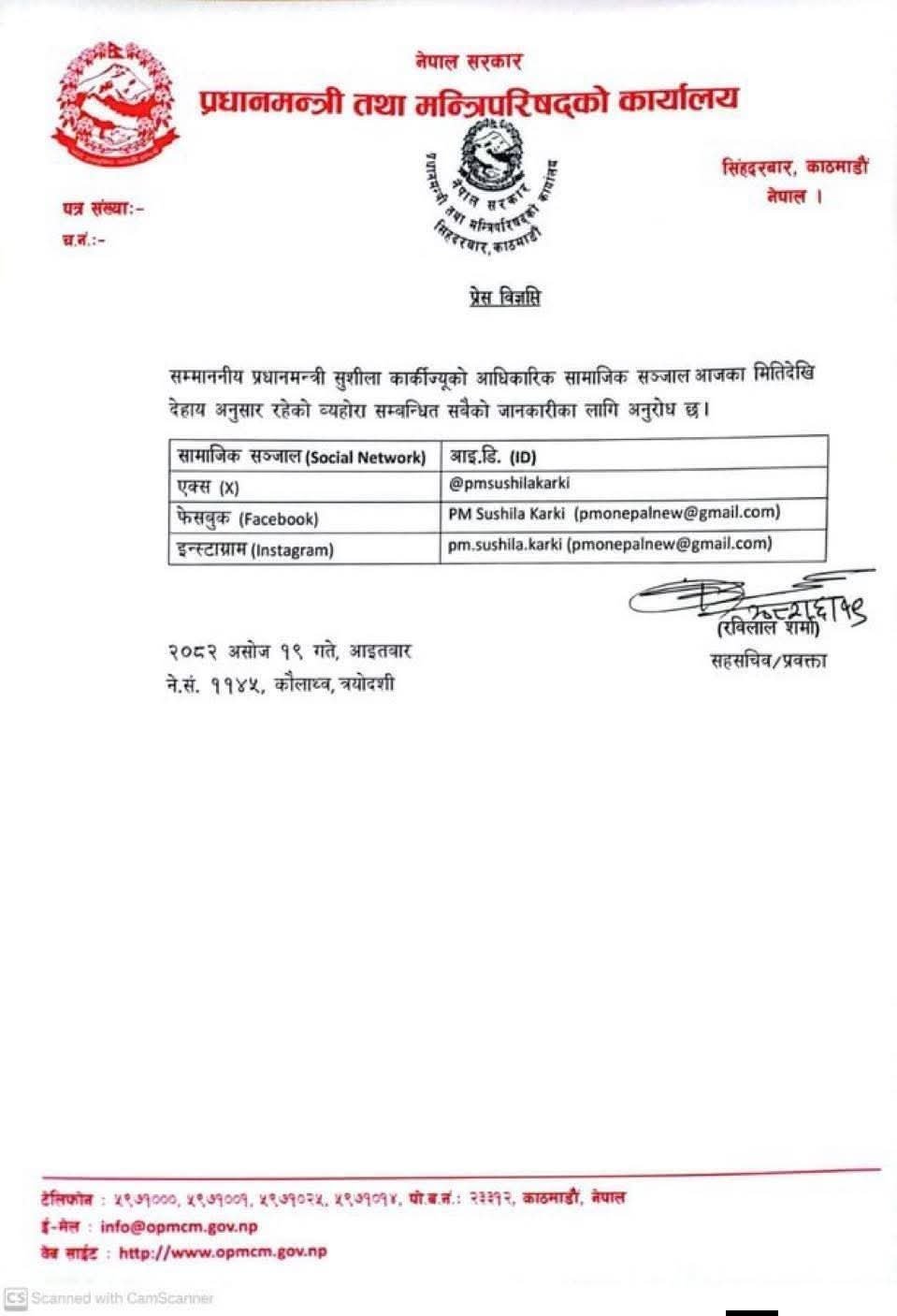 सामान्यता अघिल्लो सरकारले हस्तान्तरण गरेका सामाजिक सञ्जाल नयाँ सरकारले चलाउने प्रचलन रहे पनि यसपटक भने सामाजिक सञ्जालका नयाँ खाताहरू सञ्चालनमा ल्याइएको छ । प्रधानमन्त्री सुशीला कार्कीले निवर्तमान प्रधानमन्त्री केपी शर्मा ओलीले चलाएका सामाजिक सञ्जाल नचलाउने भनेपछि नयाँ खाता सञ्चालनमा ल्याइएको प्रधानमन्त्रीको सचिवालयले जनाएको छ ।