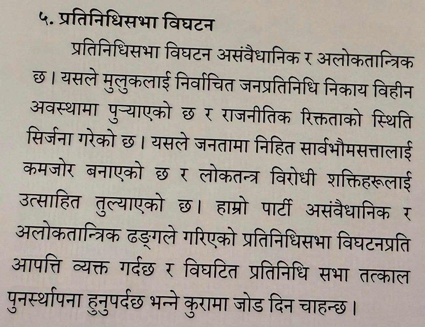 ‘मुलुकको राजनीतिक परिस्थिति र हाम्रो नीति’ शीर्षकको विशेष प्रस्तावमा भनिएको छ, ‘प्रतिनिधिसभा विघटन असंवैधानिक र अलोकतान्त्रिक छ । यसले मुलुकलाई निर्वाचित जनप्रतिनिधि निकाय विहीन अवस्थामा पुऱ्याएको छ र राजनीतिक रिक्तताको स्थिति सिर्जना गरेको छ । यसले जनतामा निहित सार्वभौमसत्तालाई कमजोर बनाएको छ र लोकतन्त्र विरोधी शक्तिहरूलाई उत्साहित तुल्याएको छ। हाम्रो पार्टी असंवैधानिक र अलोकतान्त्रिक ढङ्गले गरिएको प्रतिनिधिसभा विघटनप्रति आपत्ति व्यक्त गर्दछ र विघटित प्रतिनिधि सभा तत्काल पुनर्स्थापना हुनुपर्दछ भन्ने कुरामा जोड दिन चाहन्छ ।’