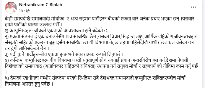 उनले लेखेका छन्, ‘कम्तिमा कम्युनिस्टहरू बीच विगतमा जस्तो सत्रुतापूर्ण सोच नबनाइ प्रधान अन्तरविरोध हल गर्न, देशमा नेपाली विशेषताको समाजवाद (अग्राधिकारसहितको संघीयता) स्थापना गर्न सयुक्त मोर्चा र सहकार्यको नीतिमा काम गर्नु पर्छ ।’