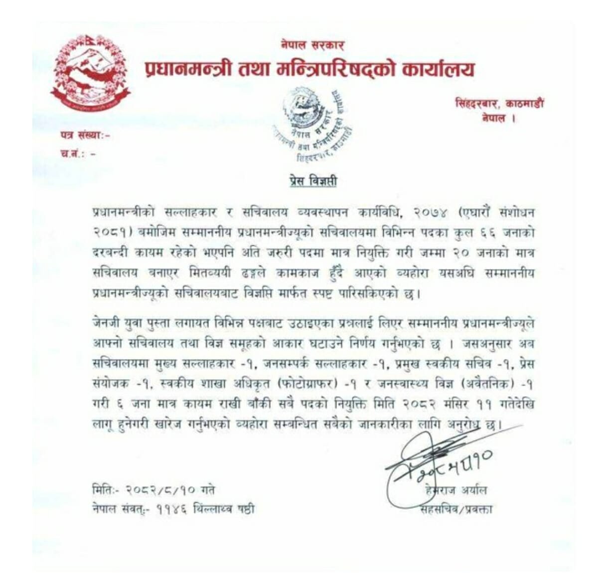 प्रधानमन्त्री सचिवालयमा अब एक जना मुख्य सल्लाहकार, एक जना जनसम्पर्क सल्लाहकार, एक जना प्रमुख स्वकीय सचिव, एक जना प्रेस संयोजक, एक जना फोटोग्राफर र एक जना जनस्वास्थ्य विज्ञ गरी ६ जना मात्र रहनेछन् ।