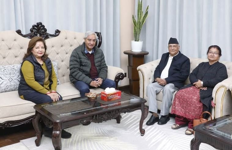 दुई नेताबीचको भेटवार्तामा देउवा पत्नी आरजु राणा देउवा र ओली पत्नी राधिका शाक्य ओली पनि सहभागी थिइन् ।
