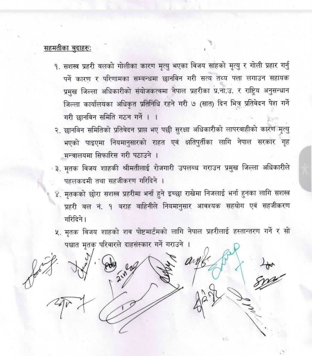 सुनसरी गोलीकाण्डः पीडित र प्रशासनबीच ५ बुँदे सहमति