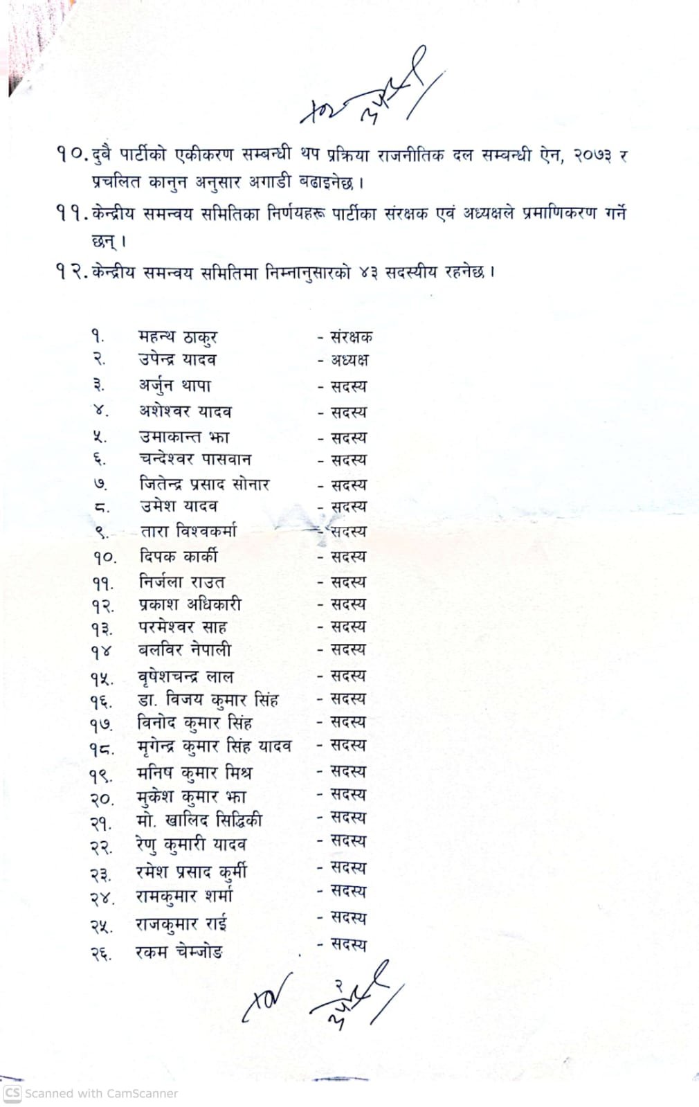 सहमतिअनुसार एकीकृत पार्टीको संरक्षक महन्थ ठाकुर हुनेछन्। उपेन्द्र यादव एकीकृत पार्टीको अध्यक्ष बन्नेछन्। अर्जुन थापा, अशेश्वर यादव, उमाकान्त झा, जितेन्द्रप्रसाद सोनार (सोनल) उमेश यादव, तारा विश्वकर्मा, दीपक कार्की, निर्जला राउत, प्रकाश अधिकारी, परमेश्वर साह, बलवीर नेपाली, वृषेशचन्द्र लाल, डा. विजयकुमार सिंह, विनोदकुमार सिंह, मृगेन्द्रकुमार सिंह मिश्र, मुकेशकुमार झा केन्द्रीय सदस्य बनेका छन्।