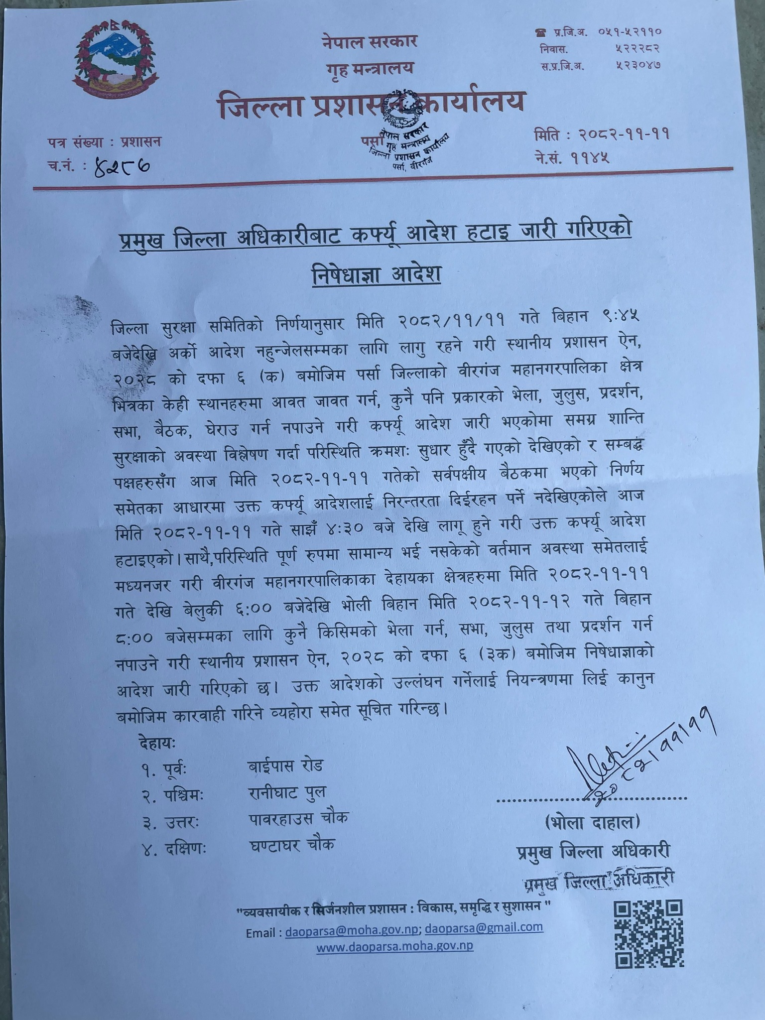 पछिल्लो परिस्थितिलाई मध्यनजर जनाउँदै पर्सा प्रशासनले बिहान ९ः ४५ बजेदेखि अर्को आदेश जारी नहुन्जेलसम्म कर्फ्यू लगाएको थियो ।