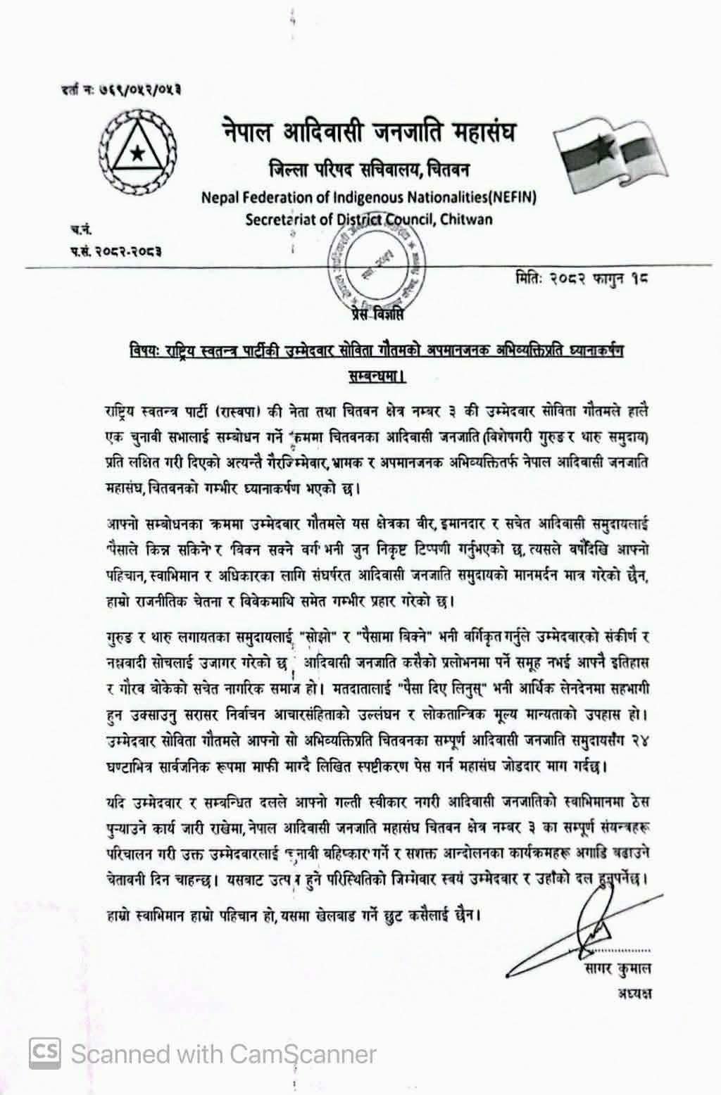 ‘आफ्नो सम्बोधनका क्रममा उम्मेदवार गौतमले यस क्षेत्रका वीर, इमानदार र सचेत आदिवासी समुदायलाई ‘पैसाले किन्न सकिने’ र ‘बिक्न सक्ने वर्ग’ भनी जुन निकृष्ट टिप्पणी गर्नुभएको छ । त्यसले वर्षौंदेखि आफ्नो पहिचान, स्वाभिमान र अधिकारका लागि संघर्षरत आदिवासी जनजाति समुदायको मानमर्दन मात्र गरेको छैन, हाम्रो राजनीतिक चेतना र विवेकमाथि समेत गम्भीर प्रहार गरेको छ’, परिषद् सचिवालयले जारी गरेको विज्ञप्तिमा भनिएको छ ।