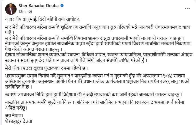देउवाले बुधबार साँझ फेसबुकमा नेपालको कानुनअनुसार सार्वजनिक पदमा रहँदा आफ्नो सम्पत्तिको यथार्थ विवरण सम्बन्धित सरकारी निकायमा पेस गरेको उल्लेख गरेका छन् ।‘म र मेरो परिवारका बारेमा सम्पत्ति सम्बन्धि विषयमा भ्रामक र झुटा प्रचारबाजी भएको जानकारी गराउन चाहन्छु,’ उनले लेखेका छन् ।
