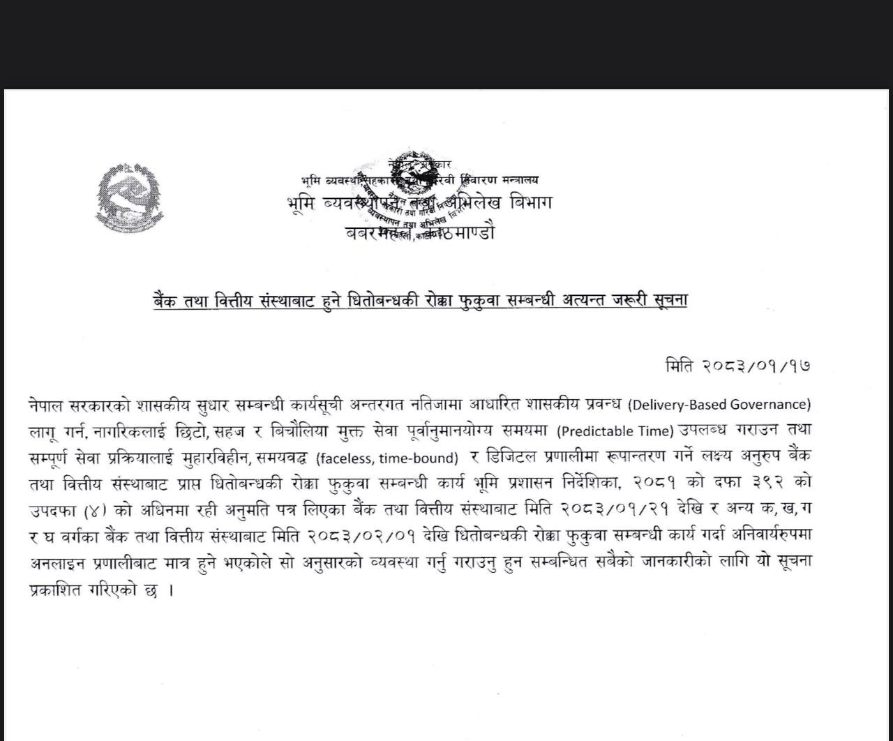 भूमि प्रशासन निर्देशिका, २०८१ को दफा ३९२ को उपदफा ९४० बमोजिम बैंक तथा वित्तीय संस्थाबाट प्राप्त हुने धितोबन्धकी रोक्का फुकुवा सम्बन्धी कार्यलाई चरणबद्ध रूपमा डिजिटल प्रणालीमा रूपान्तरण गर्ने निर्णय गरिएको हो।