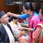 २३ कार्तिक । काठमाडौं । प्रधानमन्त्री केपी शर्मा ओलीले सरकारी निवास बालुवाटारमा आफ्ना दुई बहिनीबाट भाइटीका लगाएका छन् । उनले बहिनीहरु विष्णुमाया ढकाल र कमलादेवी कोइरालाको हातबाट भाइटीका लाएका हुन्